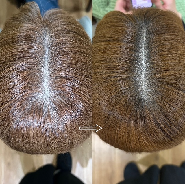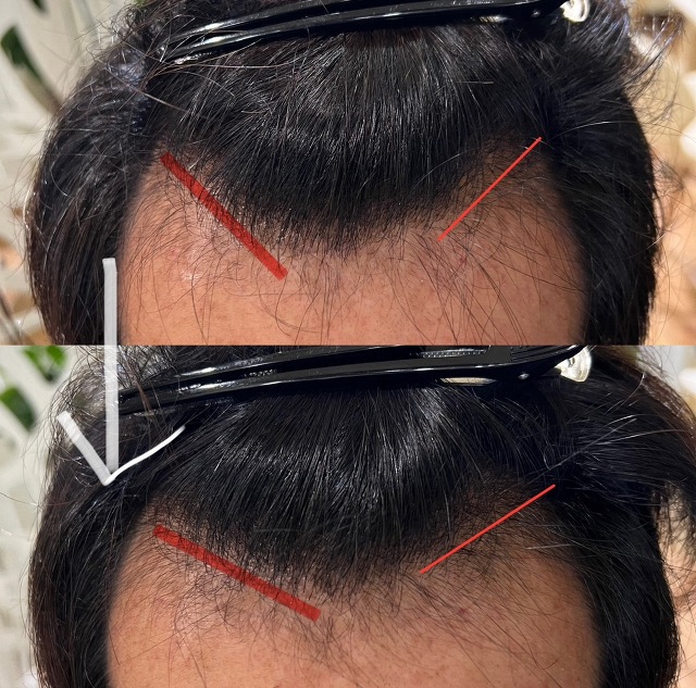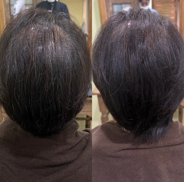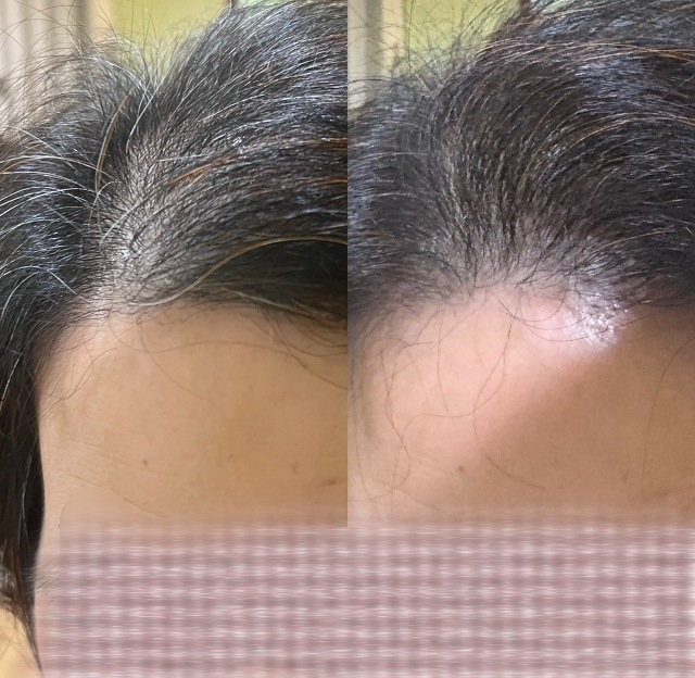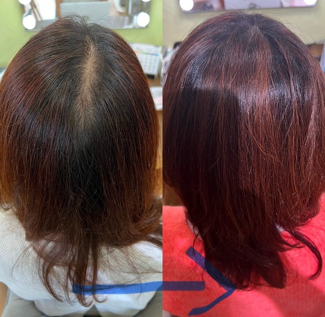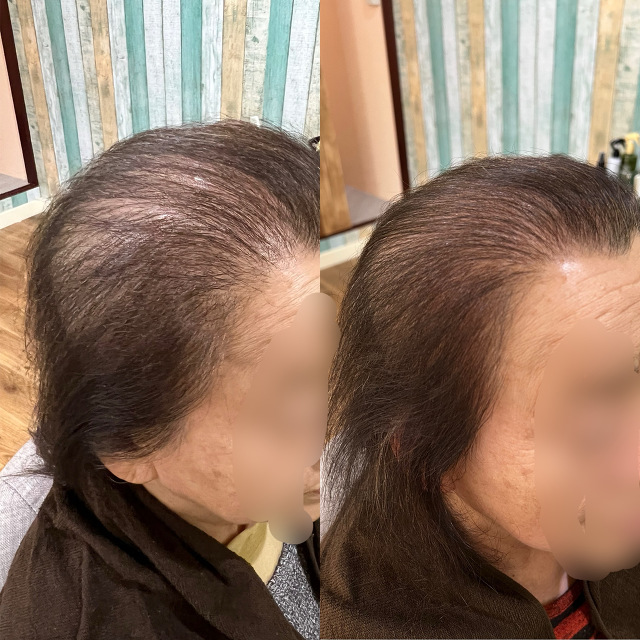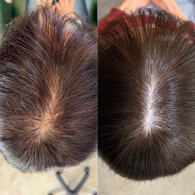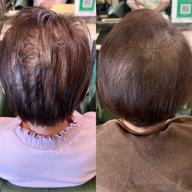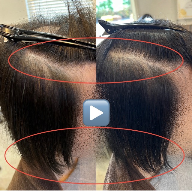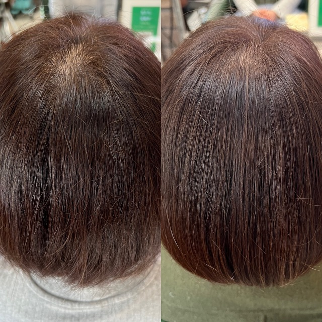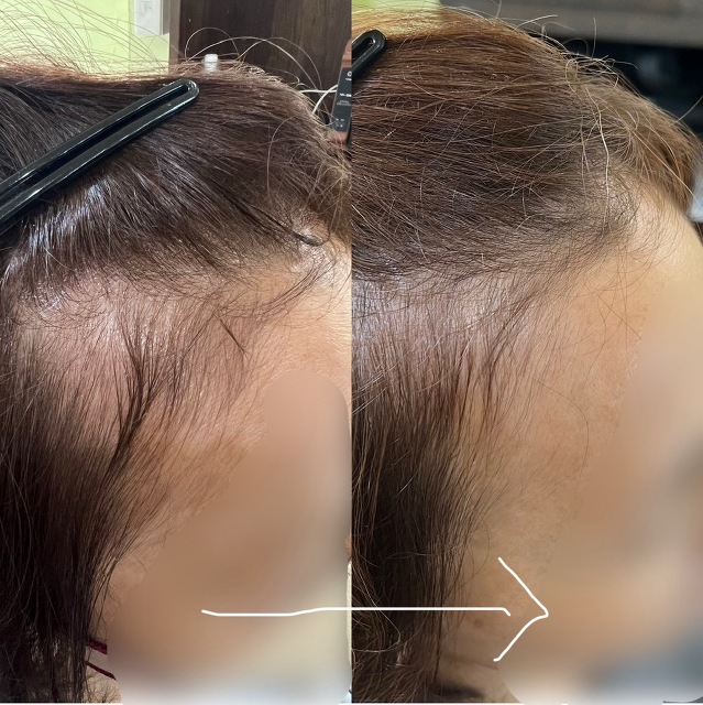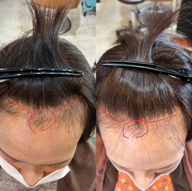 ご来店前は分け目が薄くなりつむじがパックリ分かれてしまっていました。前髪もおでこが透けてしまい下ろすこともできませんでした。