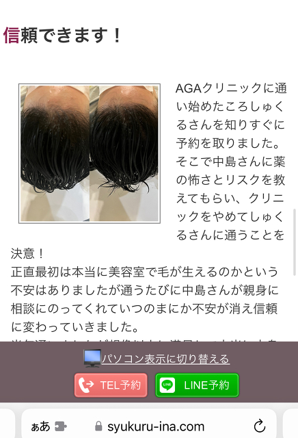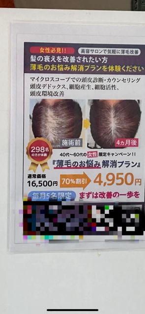 育毛専門サロンは珍しいですが、本店での実績は多数ございますのでご希望のお客様には実際のビフォーアフター写真がご覧いただけます。